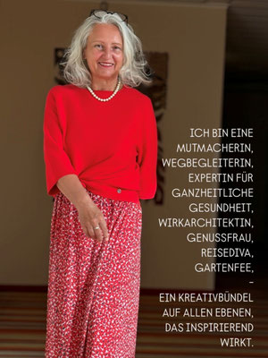 Ich bin Mutmacherin, Wirkarchitektin©, Gesundheitsexpertin, Künstlerin, Bloggerin, Genussfrau, Reisediva, Kreativbündel, Visionärin, Naturliebhaberin und schon immer Wegbegleiterin für Frauen, die sich neu entdecken und bewusst(er) leben wollen.
