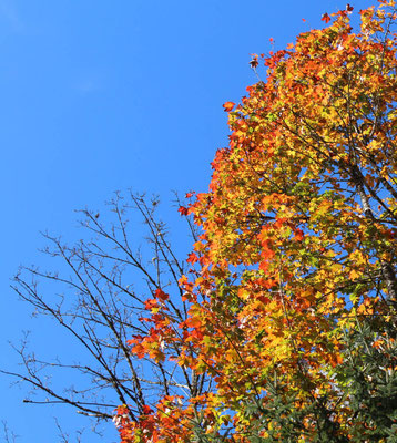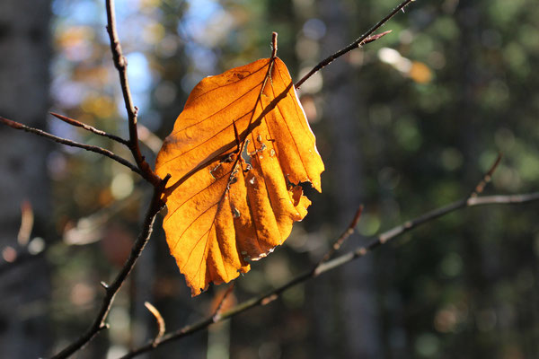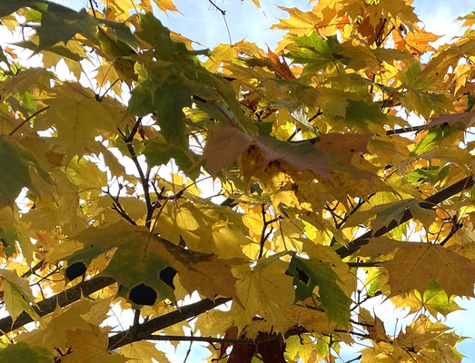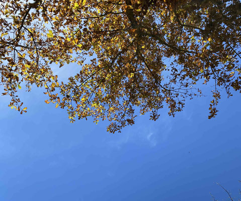 So bezeichne ich meine Fahrt. Sie entpuppt sich als ein wahres Fest für meine Sinne. Über malerische Landstriche schlängele ich mich zeitweise an idyllischen Weiden, abgeernteten Äckern und sanft hügeligen Wiesen vorbei. Der Anblick von friedlich grasenden Kuh- und Schafherden verleiht der Szenerie eine zusätzliche Portion Landidylle. Das prächtige Herbstlaub zaubert ein Farbenspiel von warmen Rottönen, leuchtendem Orange und tiefem Gelb, das die Landschaft in ein märchenhaftes Ambiente hüllt. Ich liebe den Herbst! An besonders schönen Stellen halte ich an, um Fotos zu machen. Die Luft ist erfüllt vom erdigen Duft der herabgefallenen Blätter, während die Sonne durch die Äste der Bäume glänzt und das Land in goldenes Licht taucht. Schau mal!