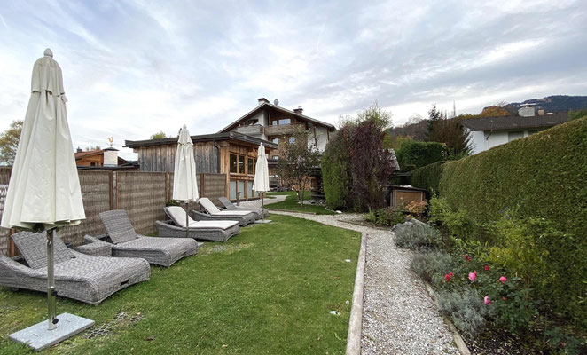 Der Garten, ein reizender Grünbereich mit 1.400m² Fläche im hinteren Bereich des Areals, mit viel Natur und modernen Annehmlichkeiten, bietet mir Entspannungserfahrung auf unterschiedliche Arten. Ein "Fußerlebnispfad" zum Stimulieren der Fußmuskulatur vermittelt mir ein sehr angenehmes Körpergefühl. Der "Whirlpool im Heustadl" ist traditionell, rustikal gebaut und mit moderner Technik kombiniert - perfekt für eine luxuriöse Auszeit im Freien. Entspannungsliegen im Grünen mit Panoramablick sorgen für tiefes Durchatmen.